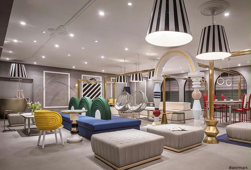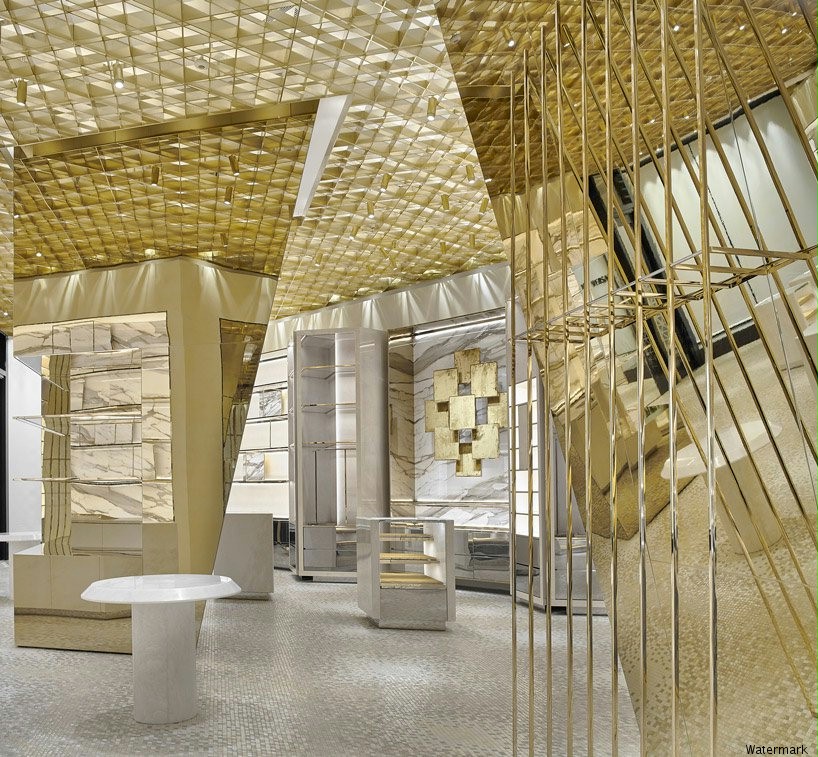 前卫创新新概念店。富有质感的室内元素,让顾客感到惊讶。店的金色让整体变得更加高端神秘,符合了品牌的定位。天花板上有钻石形状的图案,设计了商店的流程,引导游客流畅地从一个房间走到另一...