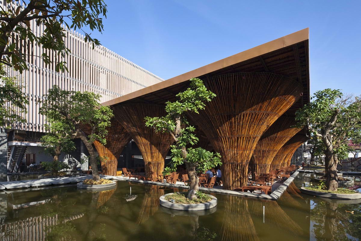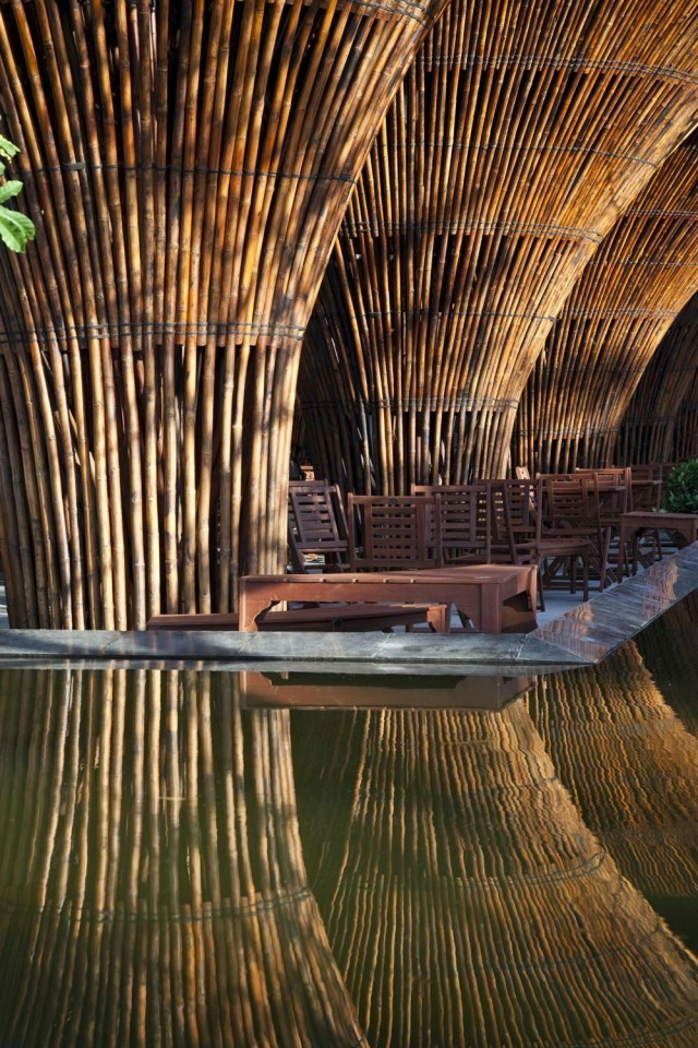 店铺设计空间整体运用自然竹木材质,传统,复古,又极具大自然舒适感,内部结构采用开放式空间,在支撑顶面的立柱上,设计师使其造型上呈现出发散式,竹材编制的立柱,不仅在造型上富有美感形成的自然间隙也保证了透气性与通光性能,屋顶覆以纤维强化塑料板和茅草。天花上半透明合成板材,也极大的保证了整个空间的光感。整个空间仿佛置身奇幻丛林