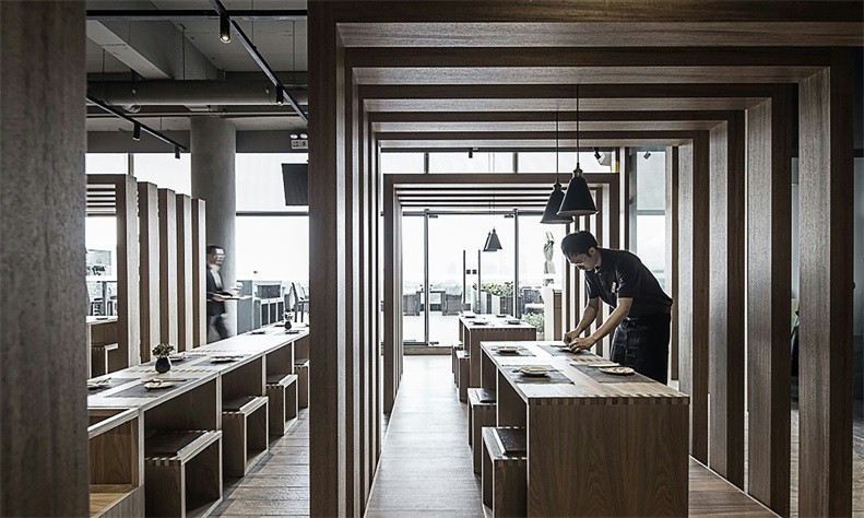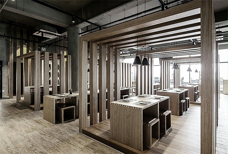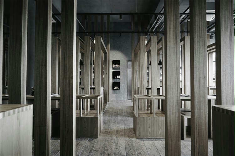 店铺设计大面积采用木质材料。造型上线性设计结构,使整个空间采光上得到充分保障,分隔的区域可为食客提供半私密的空间,座椅的设计简洁大气,人性化的设计也极大的利用了空间的收纳,建筑保留原有的混凝土天花板和墙壁,在表面做简单的处理,与木材天然原始完美结合。营造出宁静质朴的就餐气氛。