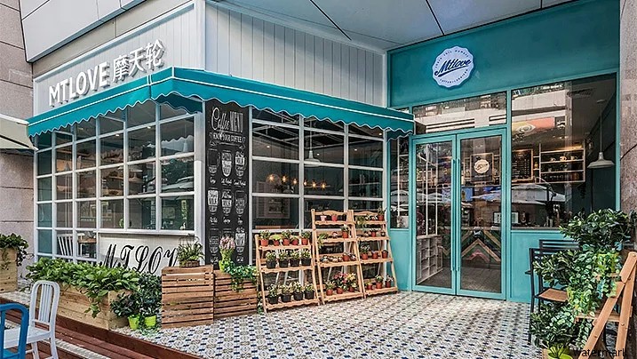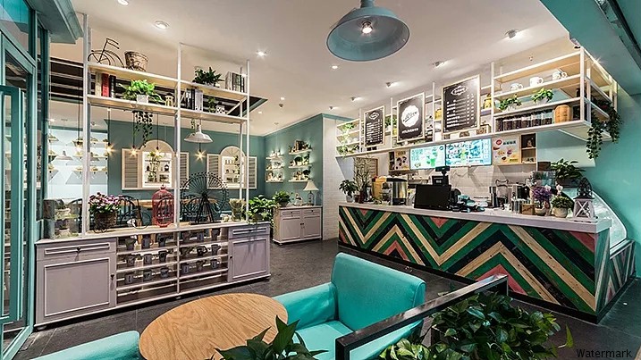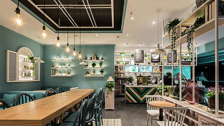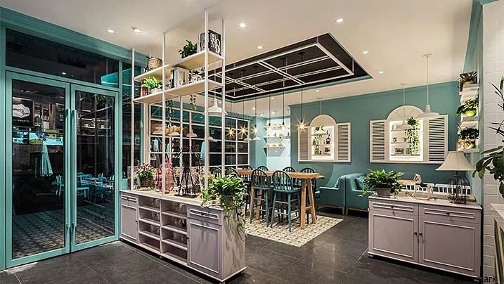 设计师巧妙的运用了蒂芙尼蓝,白,黑三种为主要基调色彩,为食客们营造出一种小清新舒适的氛围,来感受生活最真挚的惬意,令你不由自主地放慢了节奏,带来无处不在的享受。咖啡馆内种植多肉和各种花卉,与空间的颜色融为一体,处处洋溢着清新的味道。一边享受着咖啡的香气一边感受整个空间洋溢着惬意和幸福感。