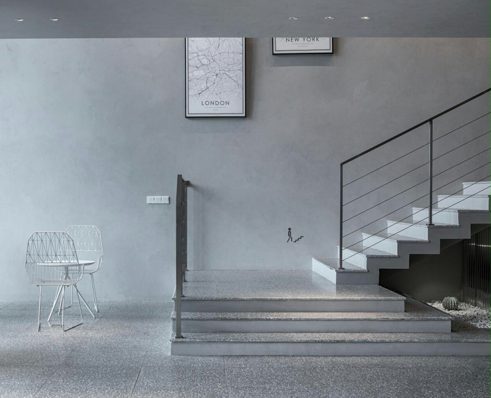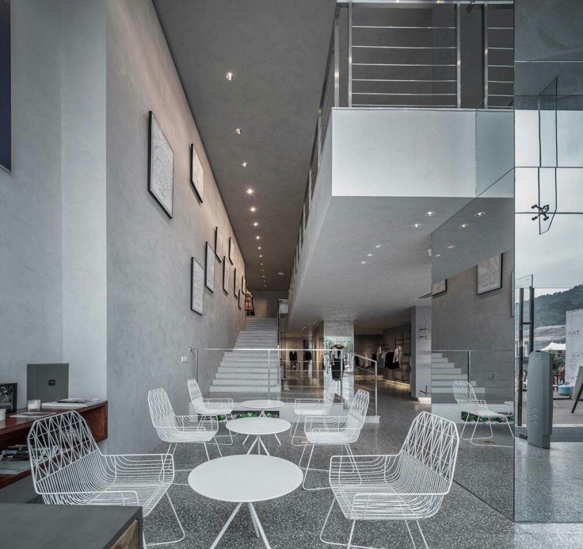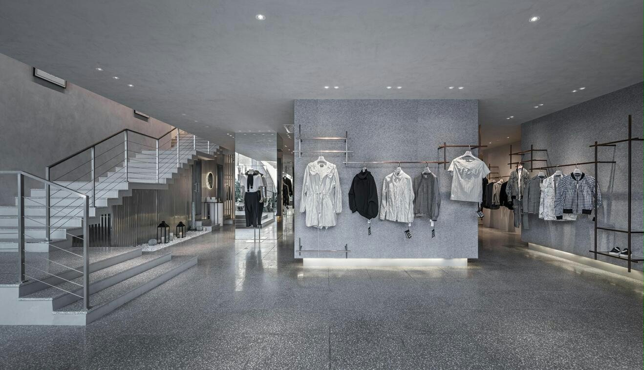 商业设计理念是用艺术的方式来设计时尚买手店。不同灰色系材料呈现出丰富的层次和质感,使得空间的质感丰富且细腻。毛毡、水磨石、花纹铝板、波纹铝板、清水混凝土、艺术涂料、木材和大理石等材料,在空间里交错组合,共同营造了一个微妙的“灰”空间。在自然光和人工照明的配合下,这个灰色的空间透出淡雅宁静的气质。同时灰色“艺术馆”空间所具有的仪式感和神秘感,使得陈列其中的商品获得了艺术化的升华,增强了设计师服装的品质感,有效的提升了人们的购物体验。