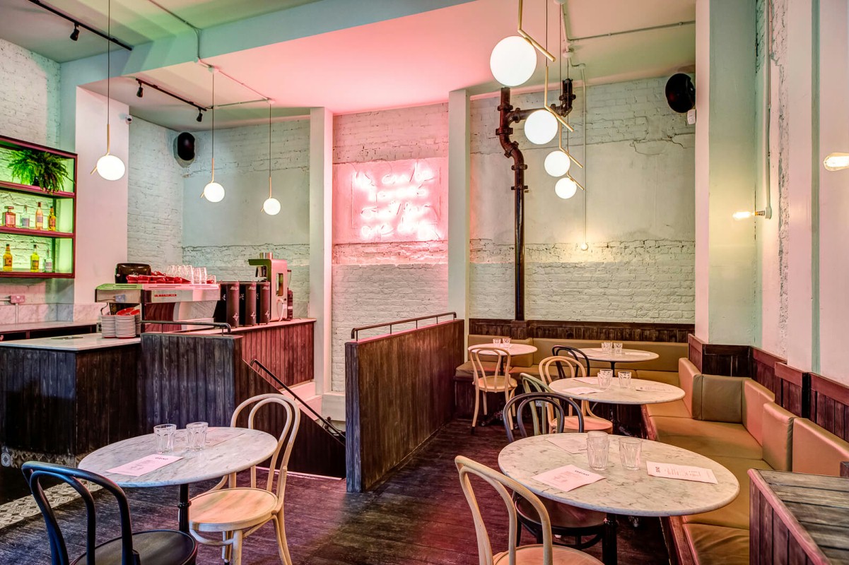 典型的白色砖墙的设计,给人温馨简洁的感觉,重新加入了充满活力的淡绿色墙壁和深色橡木镶板的空间,使整个空间变得活力起来。受传统法国小酒馆现代风格的启发,加入粉色发光效果的墙壁,给人一种女性化的感觉,既亲切又充满活力。