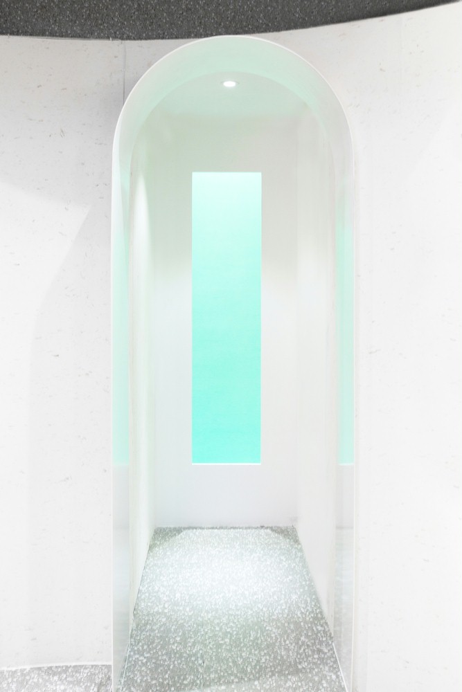 店铺设计创意点三个椭圆形的球体。发光的天花板提供了柔和光线的内部,描绘了几何学的清晰轮廓。圆形组合与场地的曲折边界相容,提供了强烈的主观几何秩序,穿过一条长长的走廊,仿佛穿越时空隧道,从一个星球走到另一个星球,开启一场奇幻之旅!