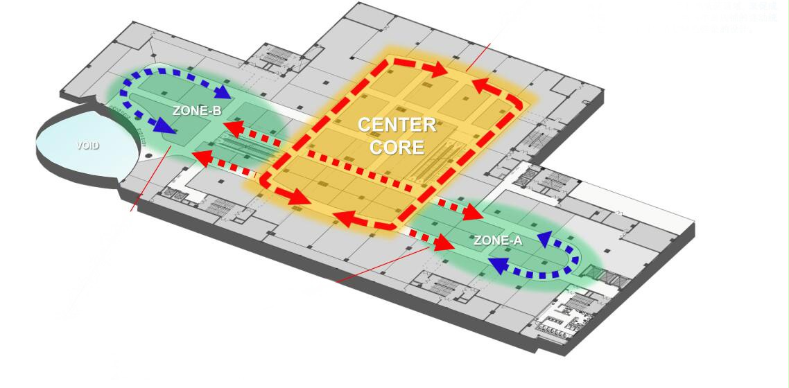 在卖场的中央设计统一装修区域,来促成大范围的环游动线。结合与中岛店铺的连动统一性,来突出变现各层特色的设计,运用明亮色块在大厅的设计上起到高档氛围!